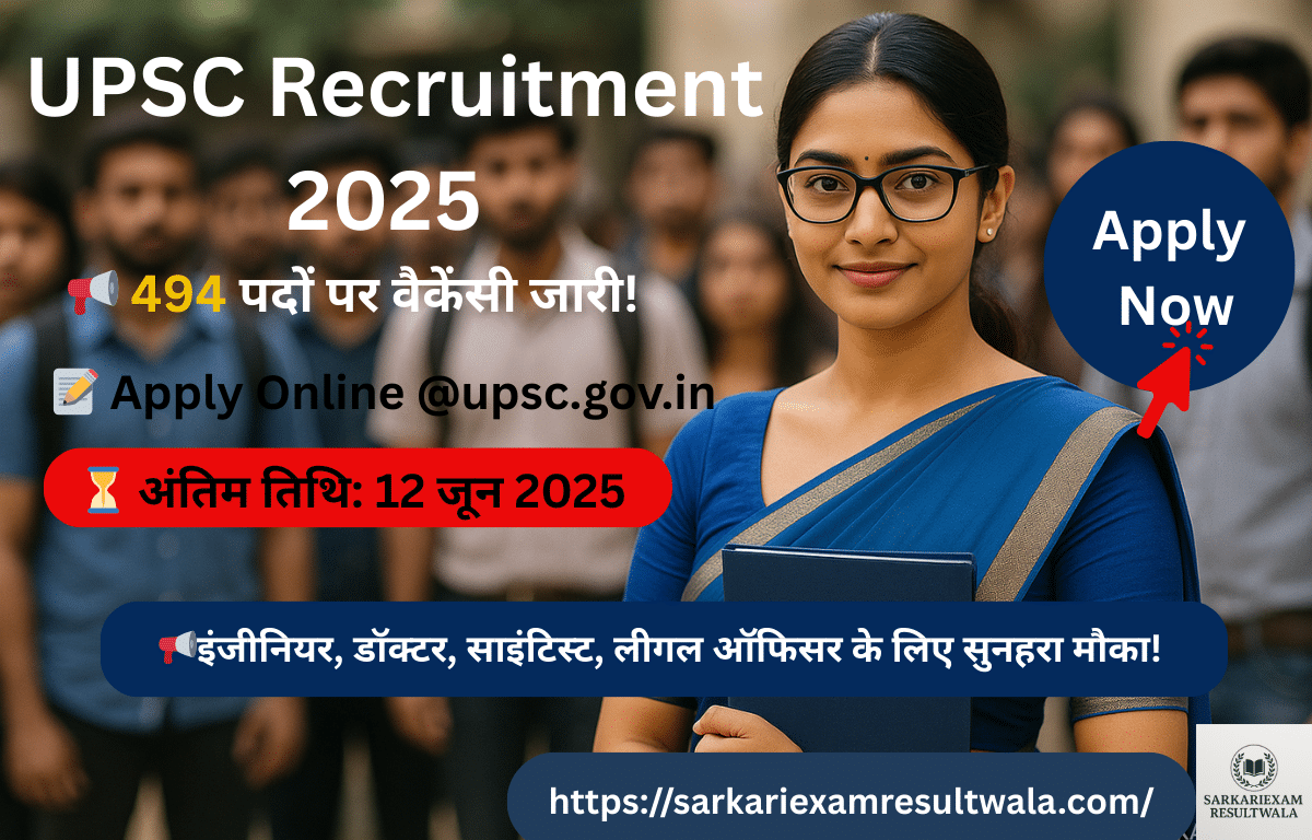 The Union Public Service Commission (UPSC) has released a detailed notification (Advt. No. 06/2025) for the recruitment of 494 posts across various departments of the Government of India. This UPSC Bharti 2025 includes vacancies for Legal Officers, Scientists, Public Health Specialists, Assistant Engineers, and more. The last date to apply online is 12 June 2025.